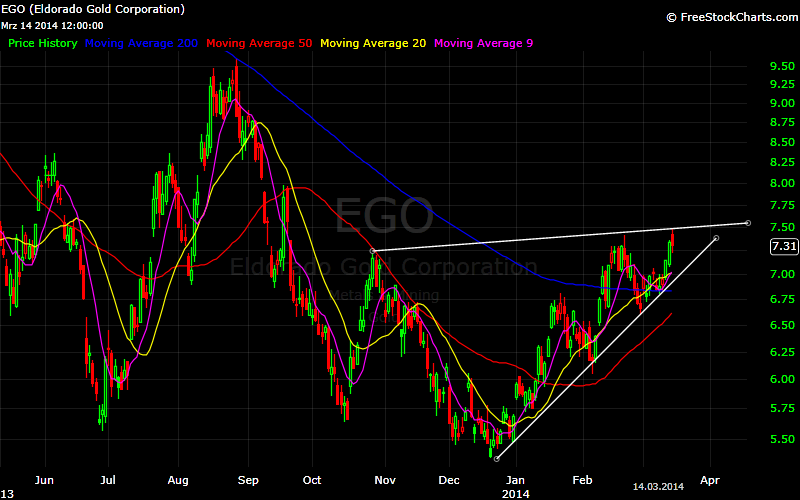 EGO ist so eine Sache: oben abgeprallt, aber unten lauert Unterstützung. Oberhalb von 7 $ kommt von unten der 9 er und 20 er MA, gleich darunter eine Unterstützung. Ich habe gestern EGO verkauft, da sie früh schon nicht vom Fleck kam, aber ein paar Prozente tiefer möchte ich wieder kaufen. beim 9 MA. Siehe chart.