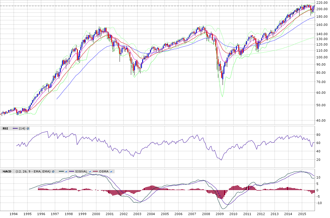 Die Aktien-Hausse dauert schon lange und grundsätzlich wäre wieder mal ein Bärenmarkt fällig. Wenn ich einen Langfristchart betrachte (siehe Chart SPY) sehe ich, dass durch die schnelle Erholung die MA's wieder zurückerobert wurden und es kann durchaus nun nochmals 2 Jahre hoch gehen wie Ende 1998. Demgegenüber steht aber, dass der macd trotz Allzeithoch (oder knapp dran) arg in negativen Gefielden steht (viel mehr als 1998) und der MACD mehr wie Mai 2008 ausschaut, obwohl anno dazumal die MA's nicht mehr zurückerobert werden konnten.