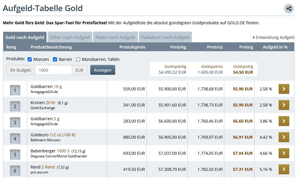 Aufgeldrechner gold.de bemüht und die 100g Barren ausgewählt. Bei fast allen mit wenig Aufgeld war übrigens immer Anlagegold24 führend. Ausgewählt, Anzahl und dann......nicht lieferbar. Nächster Preis deutlich höher. Mal sehen, was jetzt die Tage so an Angeboten kommt.