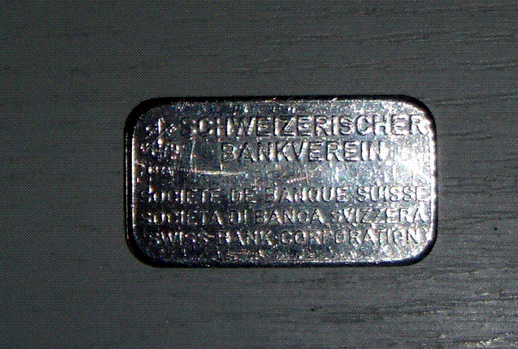 Dieser Barren ist von der Basler Bank Schweizerischer Bankverein, der 1998 mit der Schweizerischer Bankgesellschaft fusionierte. Ende 2006 hatte ich meine ersten vier 100g Barren gekauft, zwei davon mit 10 % Rabatt. Das nette Fräulein von der Bank meinte damals, die seien so dunkel gefärbt da könne sie mir unmöglich den vollen Preis verlangen. Na ja, da habe ich halt die 10 % dankend angenommen.