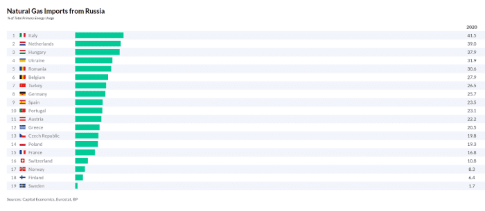 Europe gets 40% of its natural gas from Russia. So, when Western countries slapped sanctions on Russia, they had to exclude this fuel, weakening the measures considerably. Sanctions aside, it’s obviously poor security policy to be so dependent on Russia for natural gas. This has European countries rekindling their interest in nuclear or rethinking their aversion to it, notes Goldman Sachs strategist Jeffrey Currie.