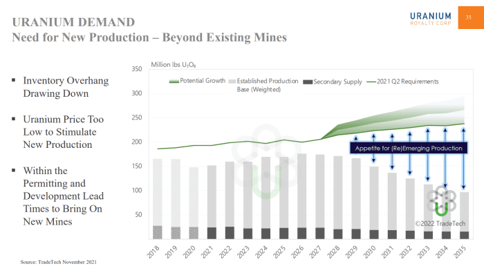 Because of underinvestment in mining over the past several years as uranium prices were so low, demand exceeds new supply by around 60 million pounds this year, says Uranium Energy. The shortfall will average around 45 million pounds per year over the next decade. The difference is made up out of secondary supplies like stockpiles and reclamation from waste. “New production will be needed to meet longer-term requirements and that will require higher prices to stimulate new mining activity,” says Uranium Energy.