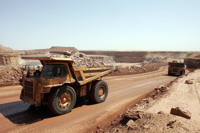 Trucks carry rocks containing uranium in Niger. (Photo by PIERRE VERDY/AFP via Getty Images)