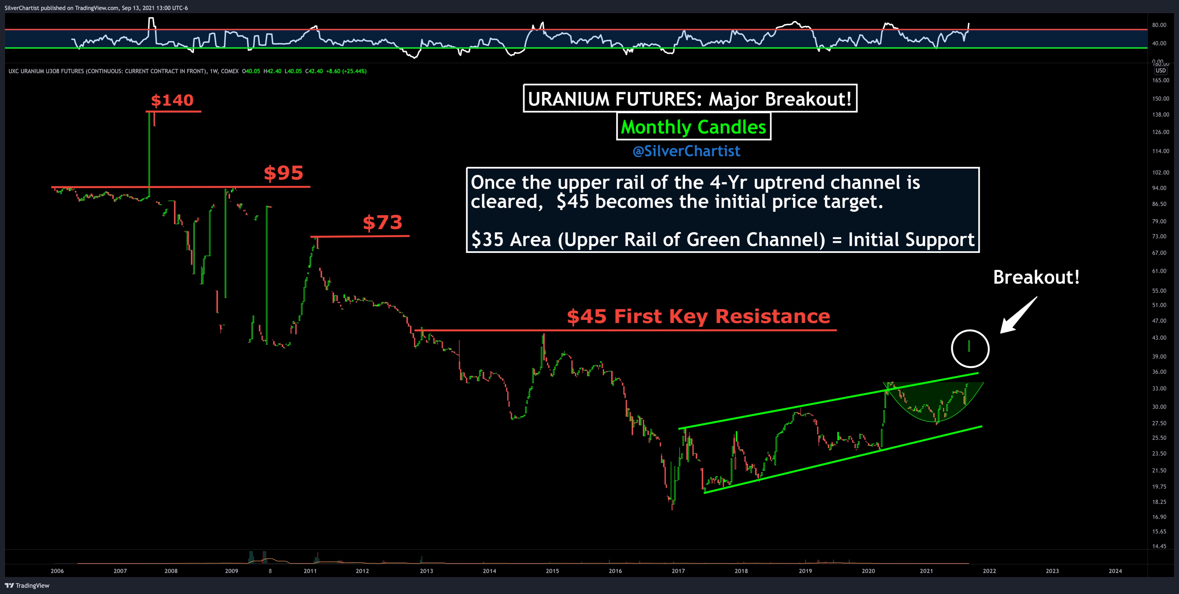 28,5 % sind also absolut bemerkenswert. Dies ist ein Damm, der brechen und jeden ertränken wird, der auf der anderen Seite lebt. Sobald Sprott wieder in der Lage ist, Aktien auszugeben, wird er in der Lage sein, mehr Uran aus dem Markt zu kaufen, als irgendjemand für möglich gehalten hätte. $180-$200 sind hier durchaus möglich (derzeit bei $45 pro Pfund).