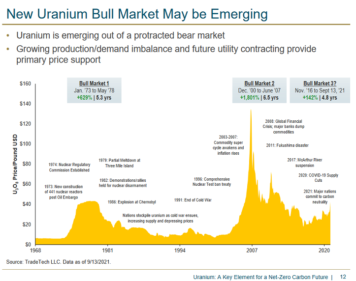 Er fügte hinzu, dass Sprott überrascht war, dass Uran jetzt Teil der Diskussion" um ökologische, soziale und Governance-Investitionen und die Energiewende ist. Kernenergie produziert weniger Kohlendioxid als Wind-, Solar- oder Wasserkraft.