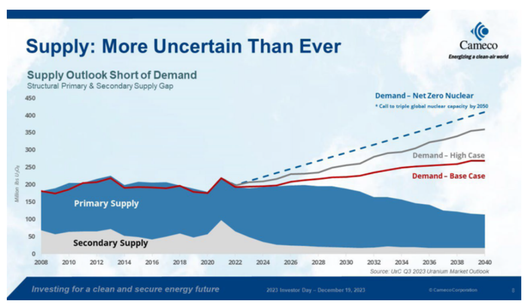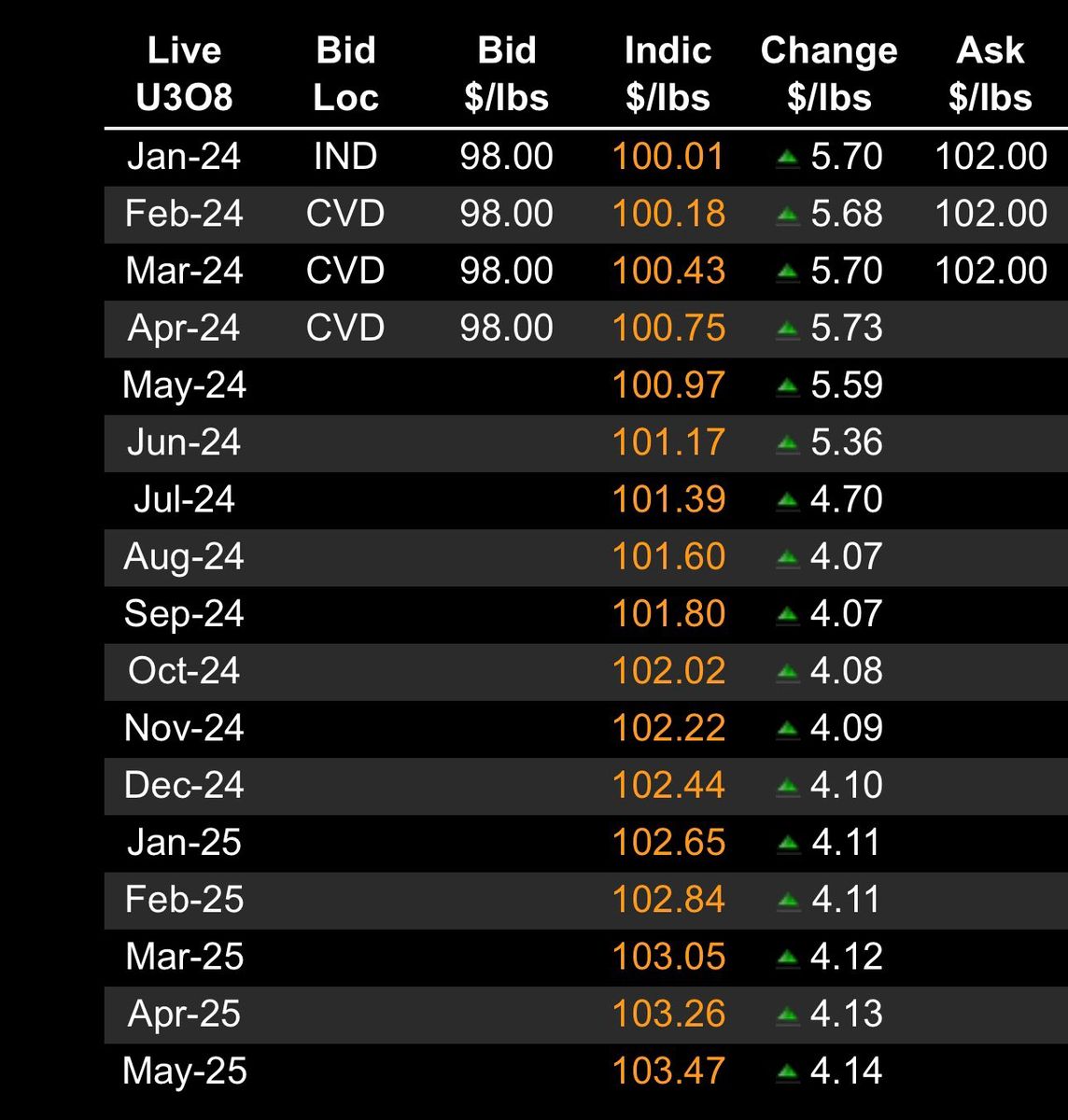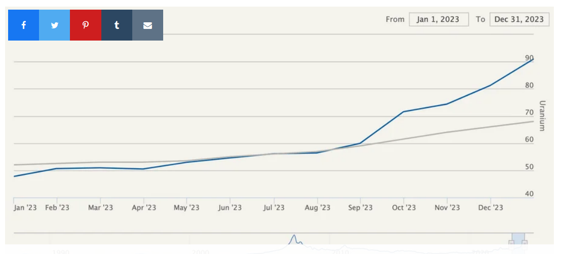 Der Uranpreis reagiert darauf mit einem Anstieg des Spotpreises von 48 $ pro Pfund auf 91 $ im Jahr 20232 und dem Preis für Terminkontrakte, der sich auf 100 $ beläuft. Es wird zwar viel über die Auswirkungen der Finanzakteure auf dem Markt gesprochen, aber der Preisanstieg in diesem Jahr wurde eindeutig von den Versorgungsunternehmen vorangetrieben, die im Jahr 2023 das meiste Uran seit 2012 gekauft haben....
