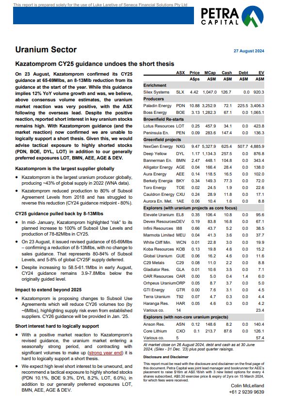 --- Kurzfristige Volatilität der Uranpreise: Der Uranmarkt hat kurzfristige Herausforderungen erlebt, darunter Preisrückgänge und exogene Markteinflüsse wie geopolitische Spannungen und wirtschaftliche Bedenken. Diese Probleme werden jedoch durch starke langfristige Fundamentaldaten, einschließlich der Angebotsunsicherheit bei wichtigen Produzenten wie Kasachstan und Russland, überwunden werden."