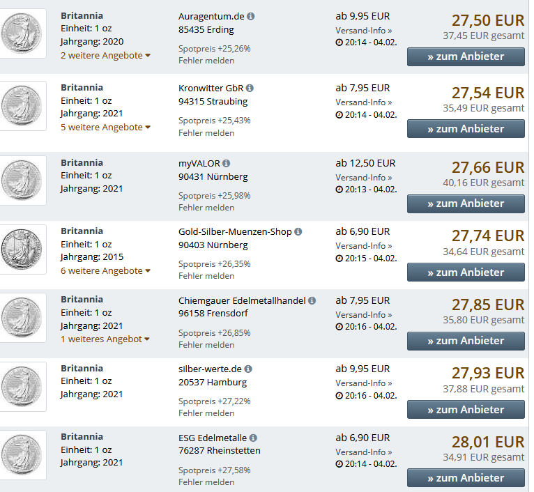 Aller anderen sind froh ihr Konfetti in EMs um wandeln zu können und das zu eindeutig als überteuert zu bezeichnenden Preisen! Handelsübliches Gold mit 2% - 8% Aufschläge sagt doch alles. Vom Silber ganz zu schweigen!