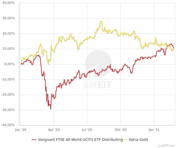 Daher möchte ich dir gern ein schönes Gegenbeispiel zeigen. In dem Schaubild ist der weltweite Aktienmarkt gegen Gold zu sehen. Man sieht sehr schön die wunderbar niedrige Korrelation bei Ausbruch der Coronakrise im Februar 2020. Meine Erwartung an Gold wurde voll erfüllt. :thumbup: