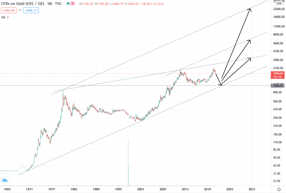 Mir sind zügige Konsolidierungen lieber, als jahrelange Seitwärtsbewegungen in Trendkanälen. Lieber jetzt kurz und knackig um die 1.600$ abprallen, also den Henkel der Tasse ausbilden die 2001 bis 2011 entstanden ist und mit Rückenwind wieder rauf zu den alten Hochs.