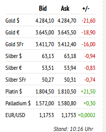 Ich würde als beauftragter 'Einkäufer' den Ratschlag von Heike_Kathrin aufgreifen ,fraktioniert einsteigen und nicht alles ins 'Goldnest' legen. Silber und Platin sind auch hübsche Bräute. ![]()