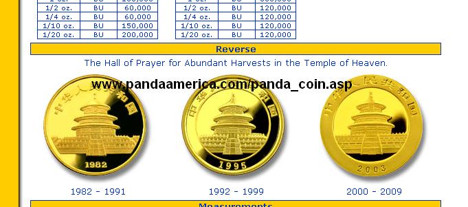 Auf verschiedenen (allen?) Internetseiten wird angeggeben, das die Goldpandas ab 2000 den Himmelstempel mit 3 Pfosten zeigen. Eine halbe Unze, die ich hier habe, zeigt aber genau wie die von Pandaamerika vier Pfosten wie in den Jahren davor.