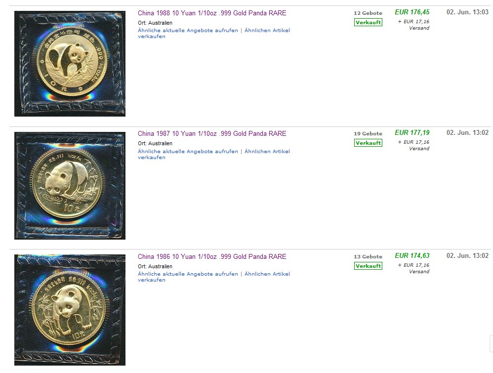 Der Sammler von Goldpandas hat zurzeit noch die Möglichkeit, alle Jahrgänge zu erwerben. Gut, in Europa ist der Markt schon sehr eng geworden. Wenn man jedoch die Märkte in China, Australien und den USA einbezieht, ist das Angebot noch ausreichend. Für die Abfertigung der Importsendung ist der Beitrag von juergenlangen sehr hilfreich: