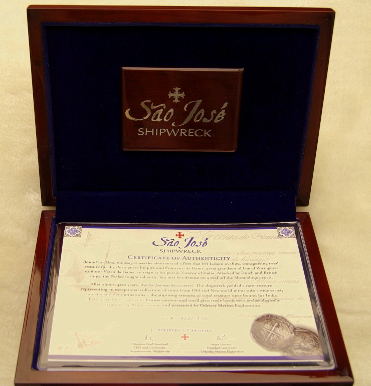 Die vorliegende Acht-Real-Silbermünze, geprägt in Mexico, stammt aus dem Wrack des Schiffes. Sie zeigt auf der Vorderseite ein Bildnis des Spanischen Königs Karl III. mit der Inschrift "DEI GRATIA" (von Gottes Gnaden), darunter das Prägedatum. Auf der Rückseite befindet sich die Inschrift "HISPN.ET.IND.REX (König von Spanien und den Indien) und das Münzzeichen von Mexico City.