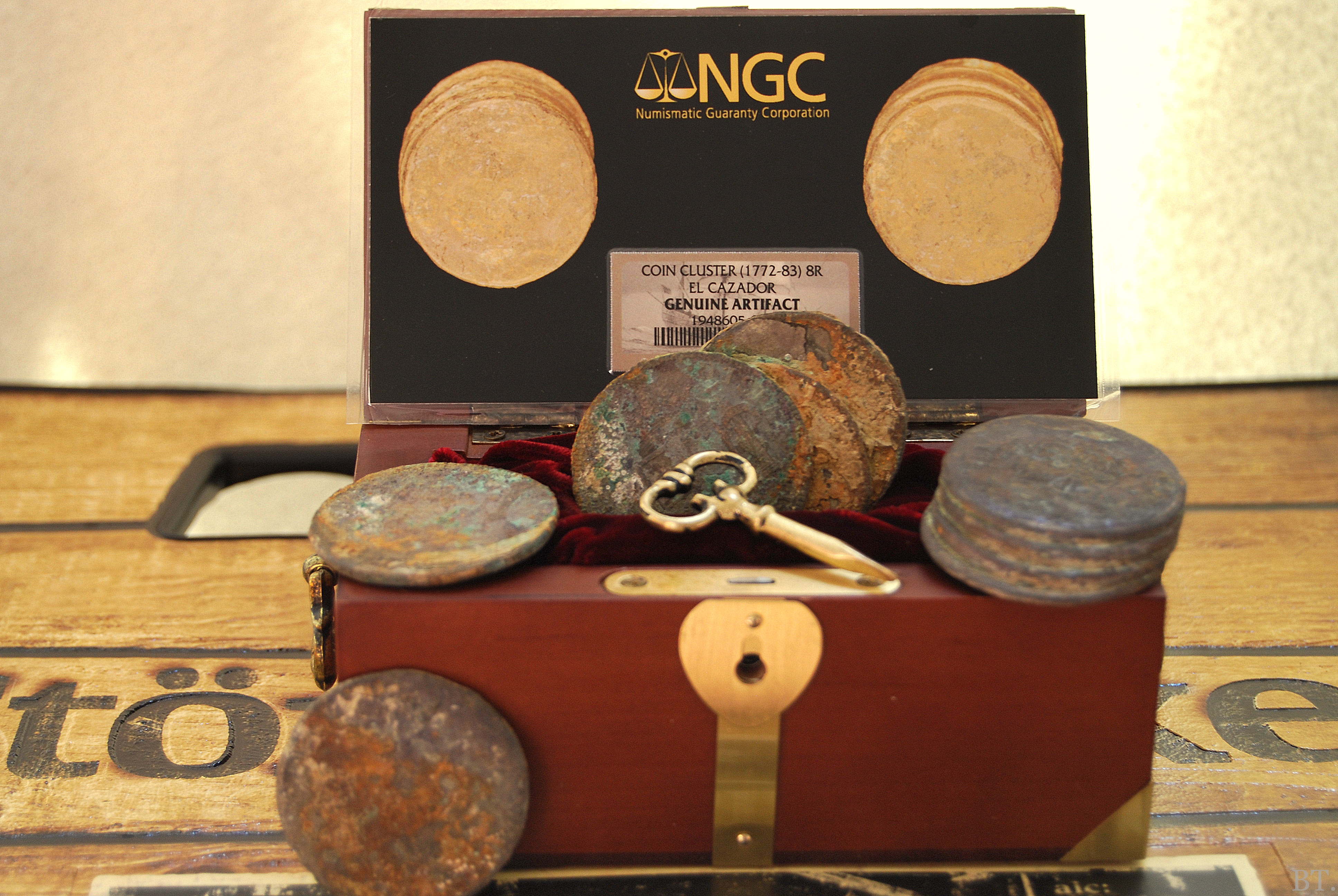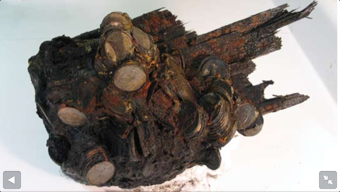 Dieses mal ein Coin Cluster aus der El Cazador. Dieses sind Münzen die durch die Unterwasser Korrosion zusammen verwachsen sind. Anbei mal ein schönes Cluster Exemplar aus der El Cazador mit der Besonderheit das dieses Cluster in seiner Echtheit von der NGC bestätigt wurde. Im Foto 2 +3 rechts daneben seht ihr eine originale Aufnahme einer Bergung solcher Clusters - sowie ein schön verwachsenes Cluster mit einem Plankenteil.