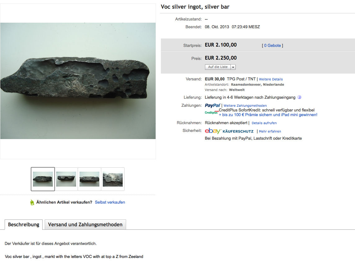 Es handelt sich auf dem Foto um einen Barren vom Wrack der Rooswijk - wie hier unter anderem von mir bereits vorgestellt - und nicht etwa von der Bredenhof, wie der Anbieter schreibt. Da er zudem das Foto von einer früheren seriösen Auktion kopiert hat und auch auf meine Nachfrage weiter anbietet, darf man ihn wohl als Betrüger bezeichnen. :boese: