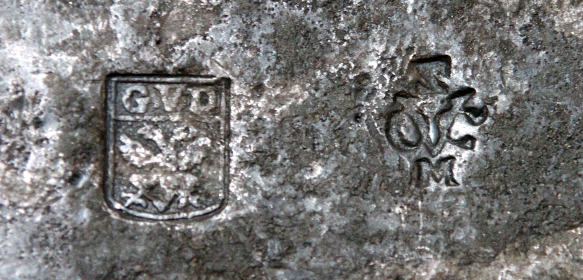 Ein sehr gut erhaltenes Exemplar der Bredenhof habe ich nun ergattert. Es zeigt das „VOC“-Emblem in einer Variante der Kammer zu Zeeland in Middelburg („ZM“). Das Wappen daneben zeigt einen doppelköpfigen Adler mit den Buchstaben „GVD“ für Gerrit van Driel.