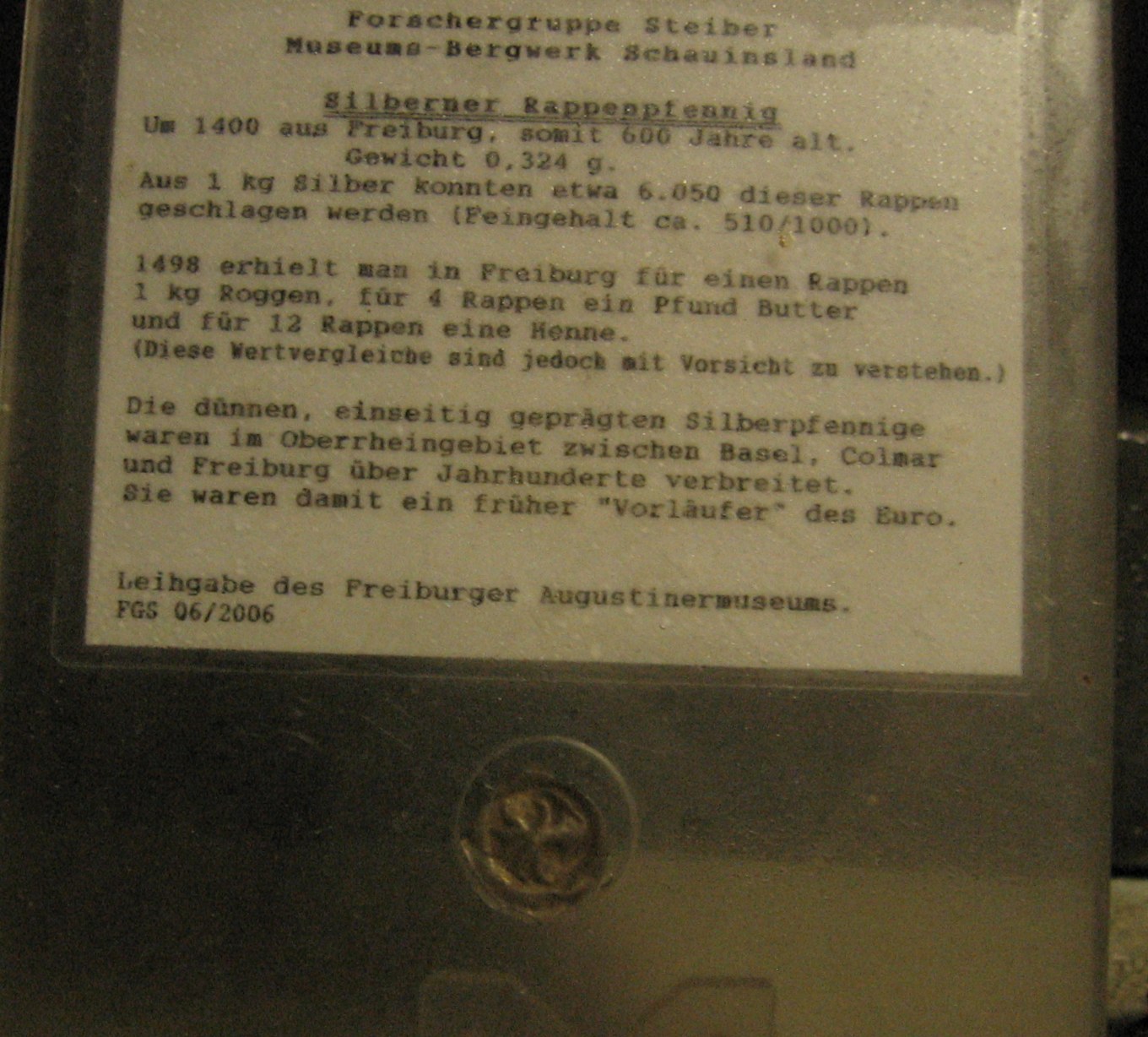 Bei einem Rundgang durch das ehemals größte Silberbergwerk Süddeutschlands wurde auch der Silberrappen vorgestellt. Eine lokale Silberwährung, die vor mehr als 600 Jahren in Freiburg, Basel und Umgebung genutzt wurde. Spannend war auch die Kaufkraft von Silber: der Rappen hatte einen Feingehalt von etwa 510/1000, also kein Vergleich zu den fast reinen Silberanlagemünzen heutiger Zeit. Das Gewicht betrug 0,324 g - weit weg von einer Unze!