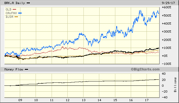 Seit 2011 Gold Top, Gold hat 30% verloren, BRK-A stieg 150% und Dow 93%