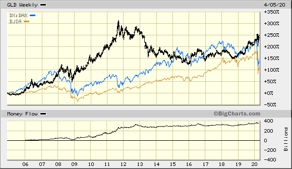 Wenn wir mal einen längeren Chart GLD vs DJ und DAX ansehen, werden diese Zacken ausgebügelt. Wie Gold in der in Jahrzehnten größten Krise -- evtll.Jahrhundertkrise -- agiert, sehen wir im aktuellen Vergleich: :saint: