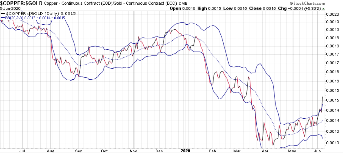 Seit April stabilisiert sich die Quote Kupfer/Gold. Ab Mitte Mai steigt Kupfer zu Gold analog der Konjunktur-Surpriseindikatoren.