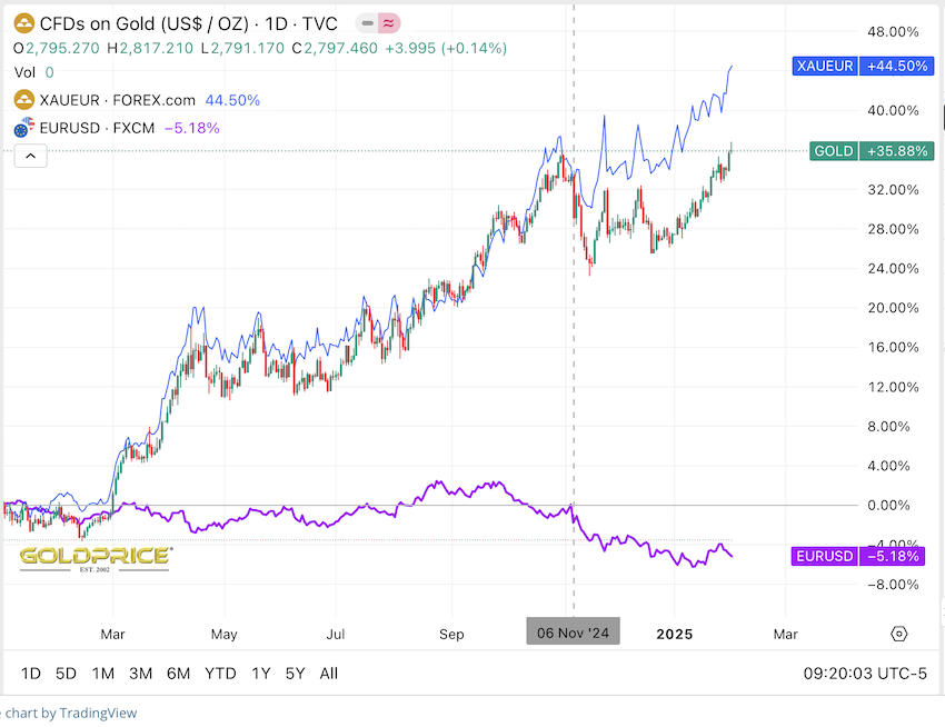 Während der Goldpreis sowohl in $ als auch in € vor dem 6. Nov. 2024 nahezu im Gleichschritt anstieg, ging das seit Trumps Wahlsieg in EUR einfach schneller...