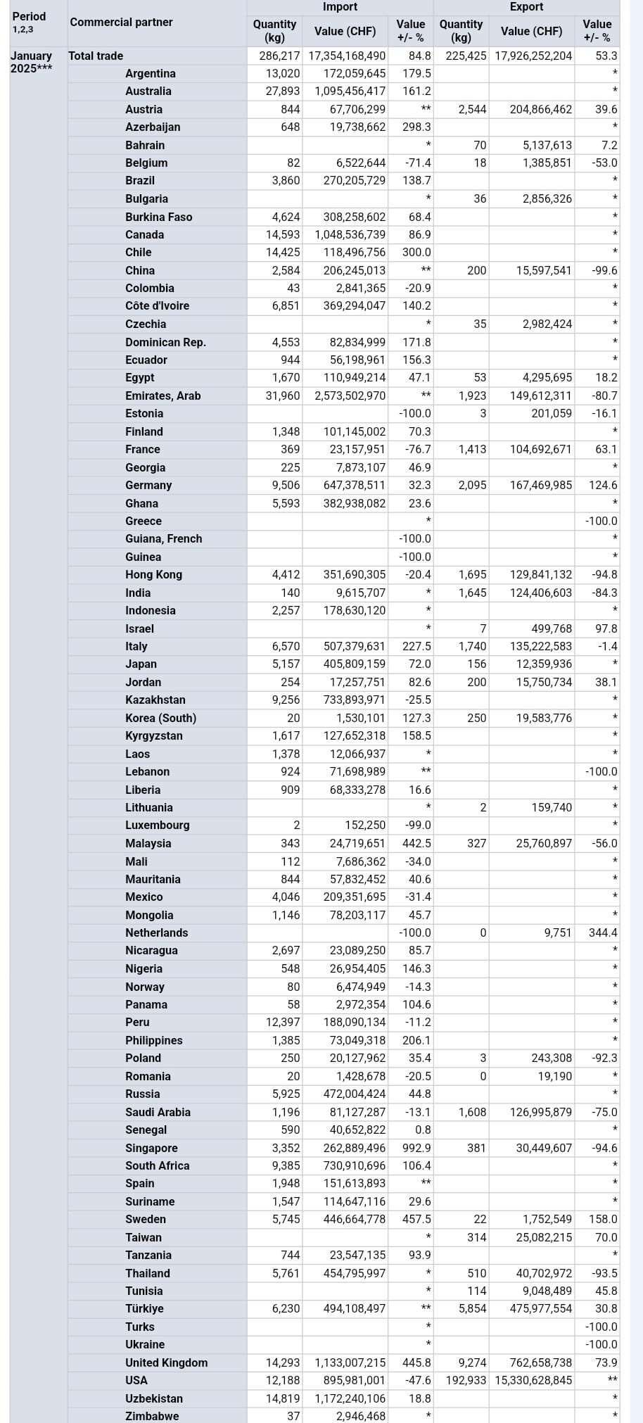 New import/export data from Switzerland show that 85.58% (192.93 tons) of exported gold goes to the USA. The largest importer was the United Arab Emirates with just under 32 tons. In total, Switzerland imported 286.217 tons and exported 225.425 tons