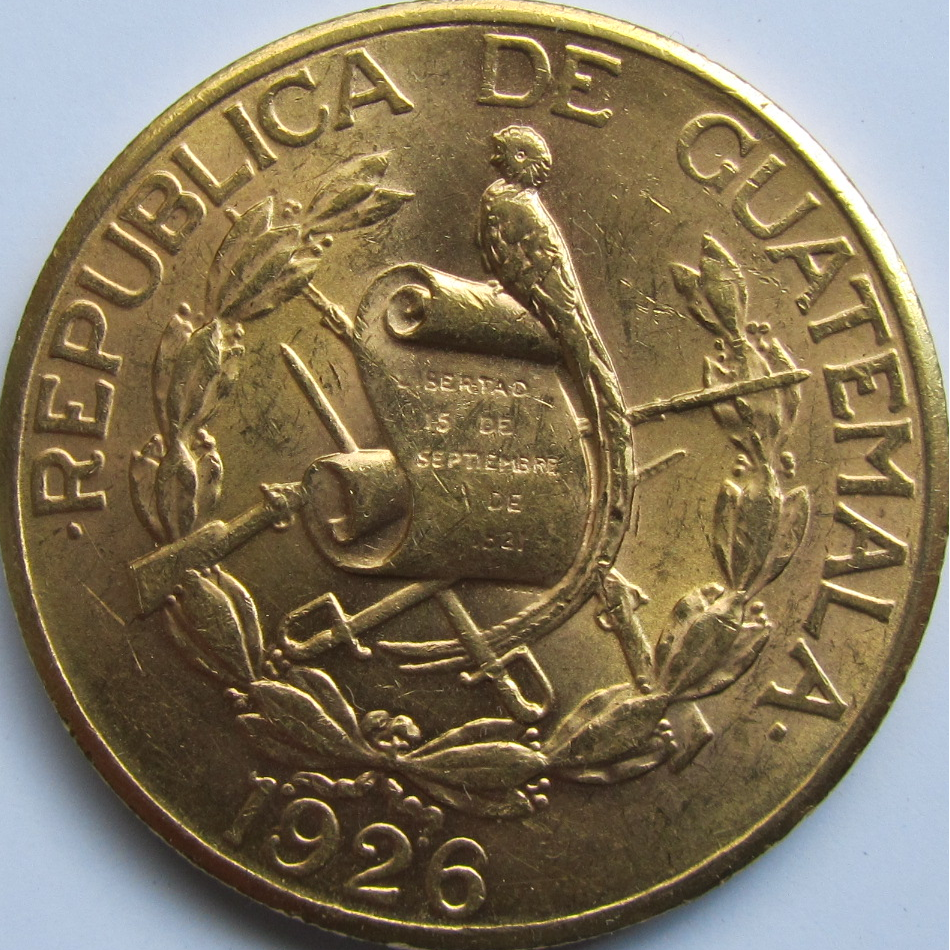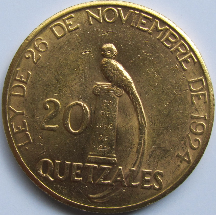 Um welche Müzen es sich handelt, ist mir klar: 20 Quetzales Guatemala, 1926, geprägt nach dem Vorbild der 20$-Goldstücke, also 900er fein, 34mm Durchmesser und 33,43g Rauhgewicht. Geprägt wurden 49.000 Stück, von denen wohl nicht alle überlebt haben, und daher eine nicht ganz alltägliche Münze. Das gute Stück hat leider schon Gebrauchsspuren und am Rand eine kleine Prüfspur (siehe Bild).