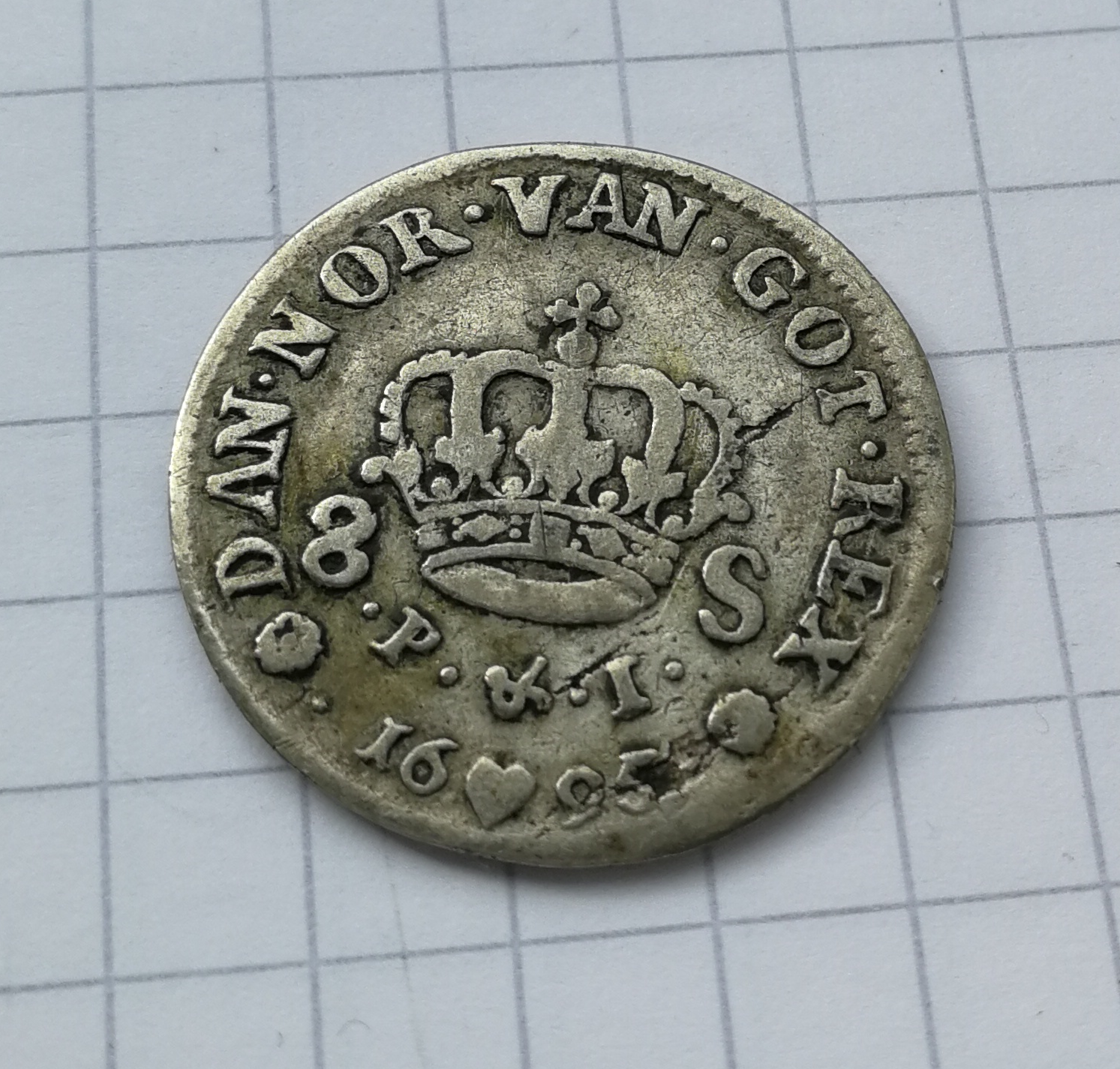 Schon vor einiger Zeit haben sich drei ältere dänische Münzen zu mir verirrt, ein Vierteldukat bzw. Drei-Mark-Stück von 1665 (0,86 Gramm), 8 Skilling 1695 (2,83 Gramm) und eine Krone bzw. 4 Mark (sogenanntes "Dickstück") von 1624 (18,2 Gramm, jeweils auf meiner eher ungenauen Billig-Feinwaage gewogen). Um was es sich handelt ist also eigentlich klar, wobei es bei den Stücken wohl unterschiedlich seltene Varianten gibt? Wenn man bissler rumgoogelt, findet man auch preislich erfreuliche Auktionsergebnisse, allerdings von wohl besser erhaltenen Stücken.