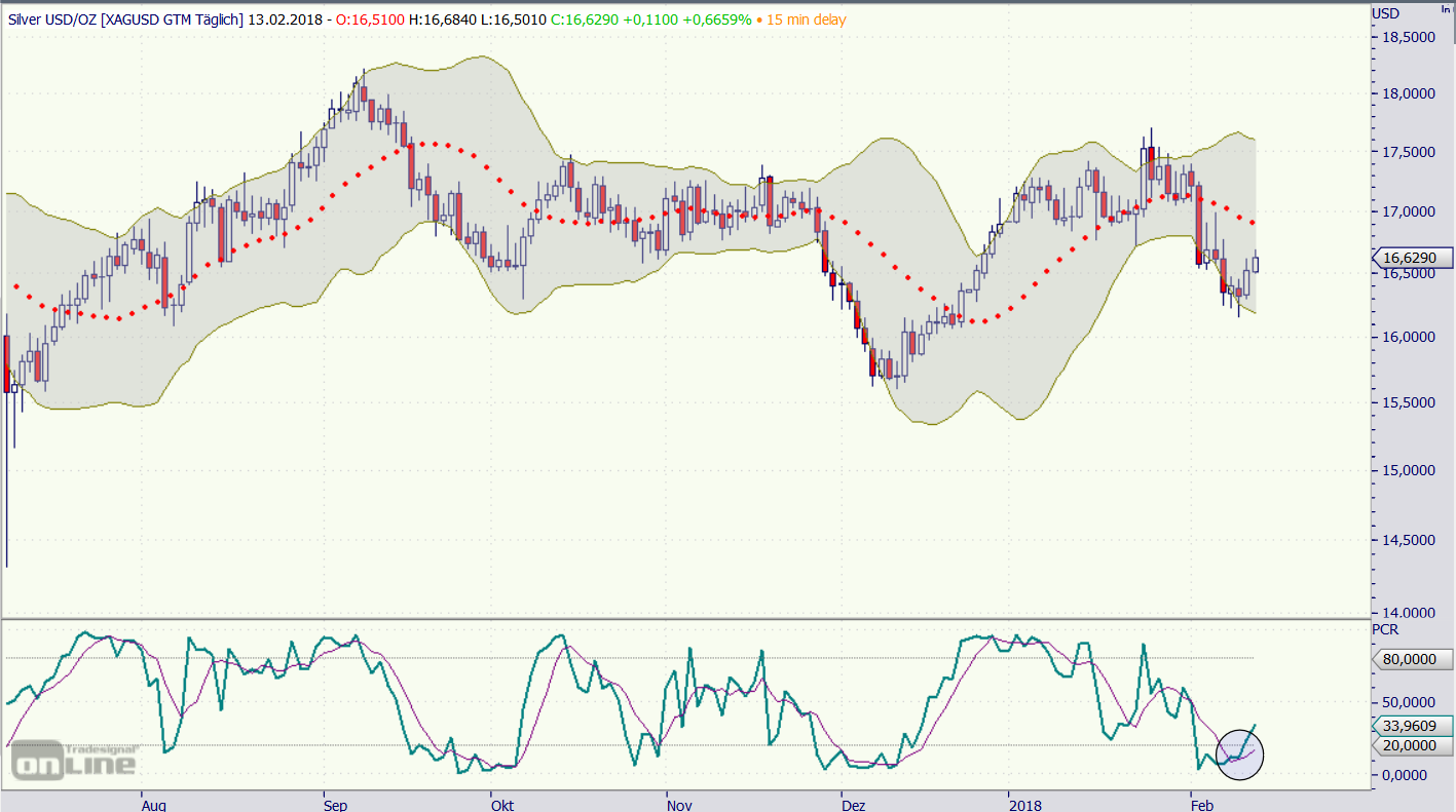 bei 16,2 $ wird im Silber-Stundenchart mit dem unteren Bollingerband eine Unterstützung gebildet.