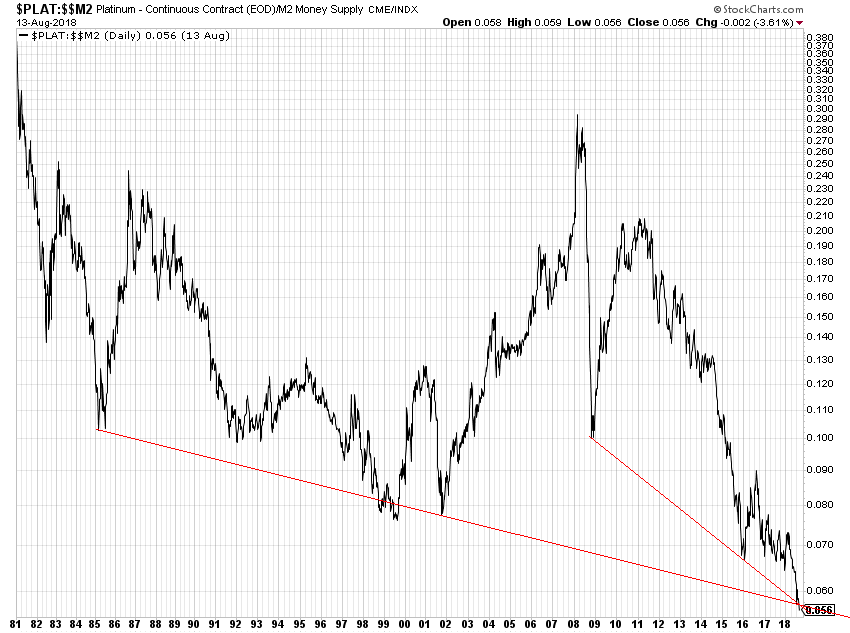 Gold, Silber, Platin geteilt durch M2 haben alle zeitgleich entscheidende Trendtiefs erreicht