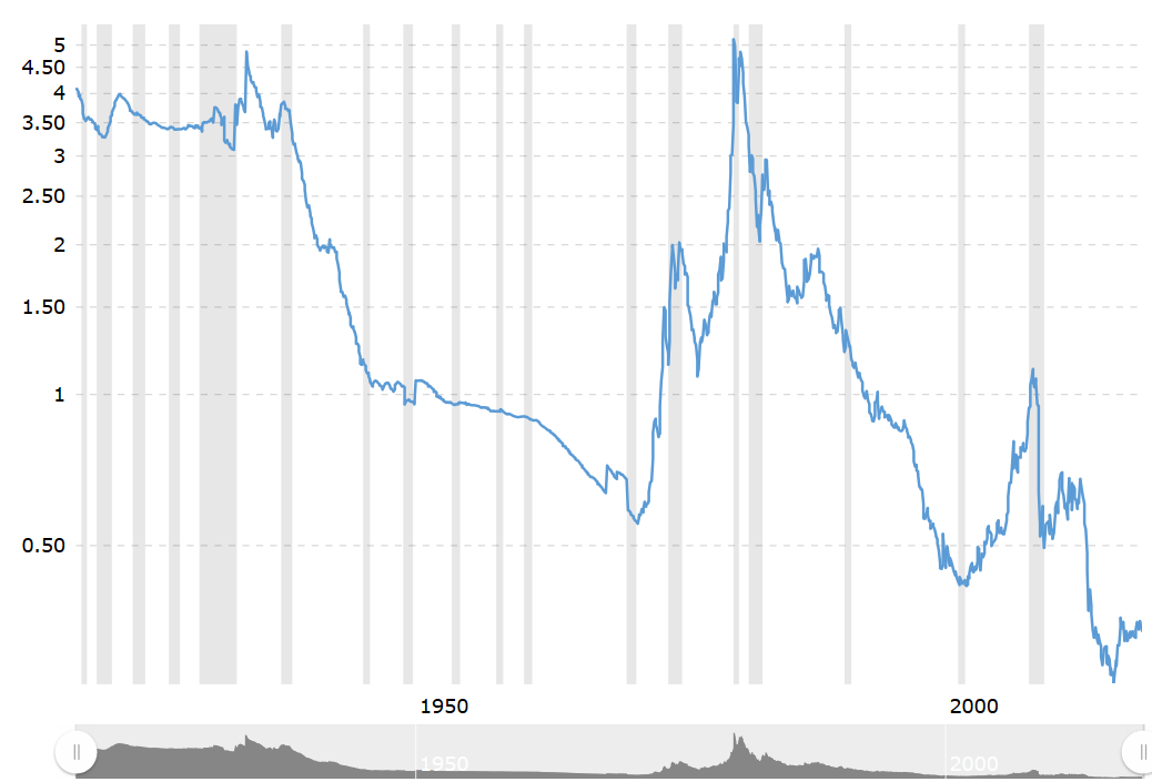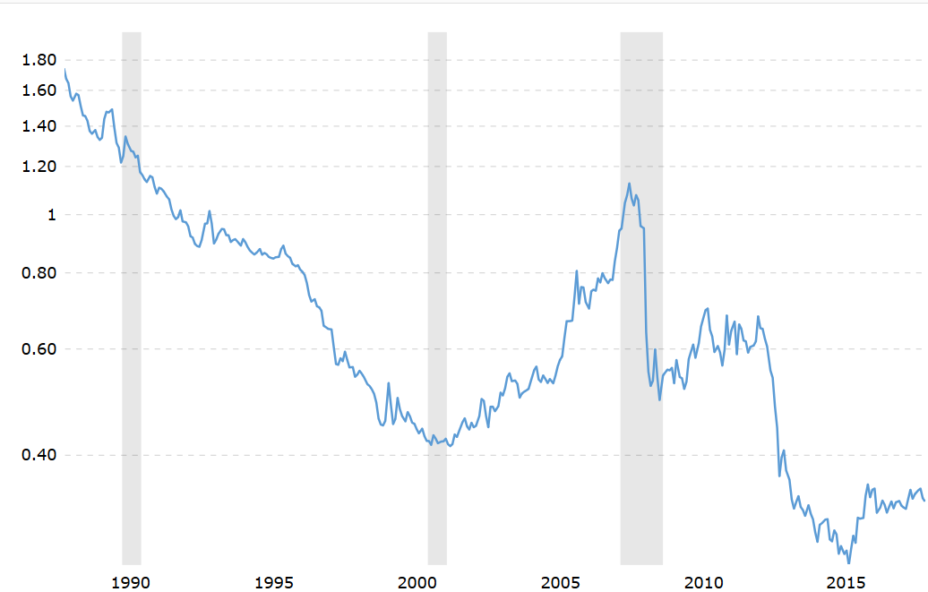 This interactive chart shows the ratio of the gold price to the St. Louis Adjusted Monetary Base back to 1918. The monetary base roughly matches the size of the Federal Reserve balance sheet, which indicates the level of new money creation required to prevent debt deflation. Previous gold bull markets ended when this ratio crossed over the 4.8 level.