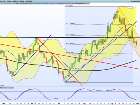 Meine aktuelle kurzfristige Einschätzung: Gold hat sich in den letzten Tagen an der 1.280 festgebissen und könnte dort nun am Aufwärtstrend einen Konsolidierungsknubbel ausbilden (blau), wie ich dies letzte Woche angesprochen hatte. In den nächsten Tagen wird sich zeigen, in welche Richtung es weiter geht. Für einen Abpraller nach oben würde ich gerne sehen, daß die 1.275 (rote Linie) hält.