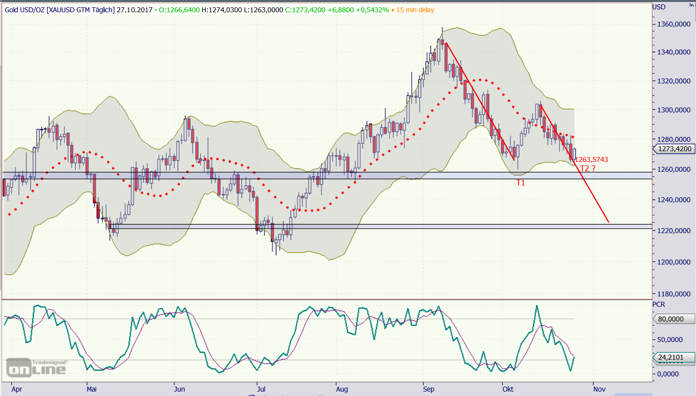Gold hat bei 1260 eine starke Unterstützungszone erreicht (unteres Bollingerband).