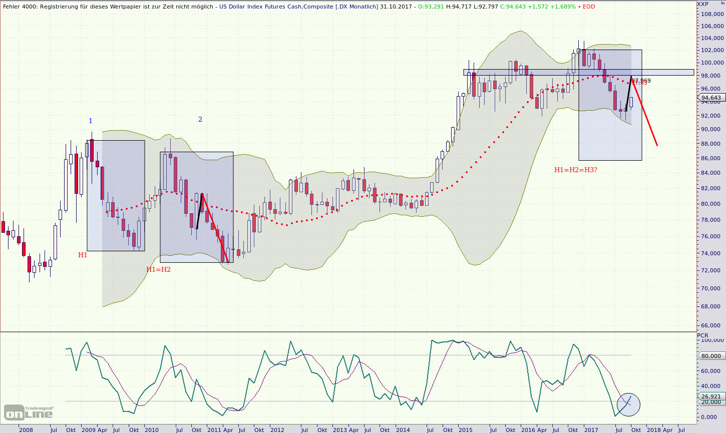 Um abschätzen zu können , wann es wieder echt aufwärts geht mit POG/POS/EM , ist es hilfreich , zu ermitteln , wo der DXY (USD-Index ) seine Erholung beendet und seine Talfahrt fortsetzt. Habe mich mit der bisherigen Erholungsbewegung auseinandergesetzt und meine , sie geht bis ca. 96 - aber die Aufwärtskorrektur a-b-c sieht an mind. 2 Stellen nicht mustergültig aus . Nebelparder - schau doch mal drüber und sag , was Du siehst. Unten der DXY. :rolleyes: Caldera