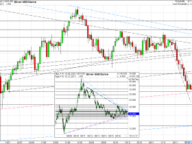 Ergänzend zu den hier schon gezeigten Gold-Charts und dem vorausgehenden Chart von nicco habe ich nachfolgend Silber langfristig aufbereitet. Als Orientierung ist als kleines Bild der langfristige Chart einkopiert (rot: Aufwärtstrend ohne Flashcrash im Juli; blau: inklusive). Im großen Chart sieht man die aktuelle Situation. Genau am Fed-Termin ist der Kurs punktgenau am roten Aufwärtstrend (den ich für wichtiger halte) abgeprallt. Bemerkenswert!