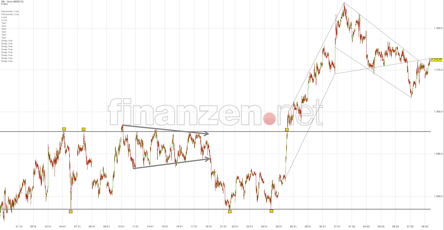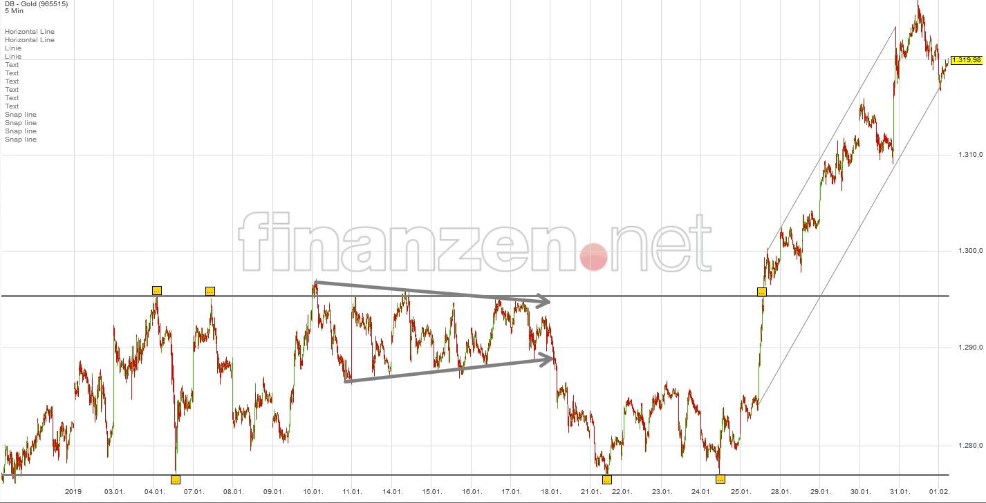 Seit dem Ausbruch aus der schwunggebenden W-Formation (25.01.) ist das kurzfristige POG-Gemälde somit wieder um eine "geometrische Figur" reicher geworden. Mal sehen, was als nächstes kommt.