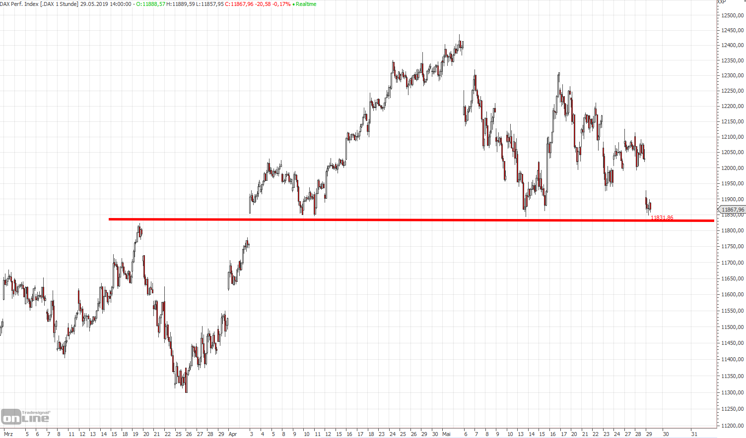 Nach dem zweiten, gescheiterten Versuch wurde Mitte April dieser Boden (Mitte zwischen den Horizontalen) jedoch signifikant nach unten durchbrochen, was auch zu einer Unterschreitung der unteren Horizontalen führte und einen Auflagepunkt für die untere Dreieckslinie lieferte, die durch den erneuten, kurzfristigen Rücksetzer Anfang Mai in etwa bestätigt wurde (die unteren Auflagepunkte sind zugegebenermaßen eher schwach).