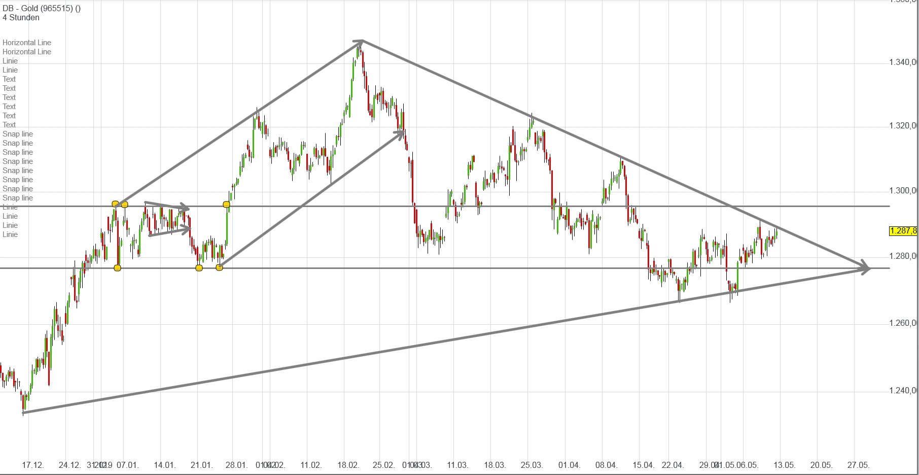 Nach dem zweiten, gescheiterten Versuch wurde Mitte April dieser Boden (Mitte zwischen den Horizontalen) jedoch signifikant nach unten durchbrochen, was auch zu einer Unterschreitung der unteren Horizontalen führte und einen Auflagepunkt für die untere Dreieckslinie lieferte, die durch den erneuten, kurzfristigen Rücksetzer Anfang Mai in etwa bestätigt wurde (die unteren Auflagepunkte sind zugegebenermaßen eher schwach).
