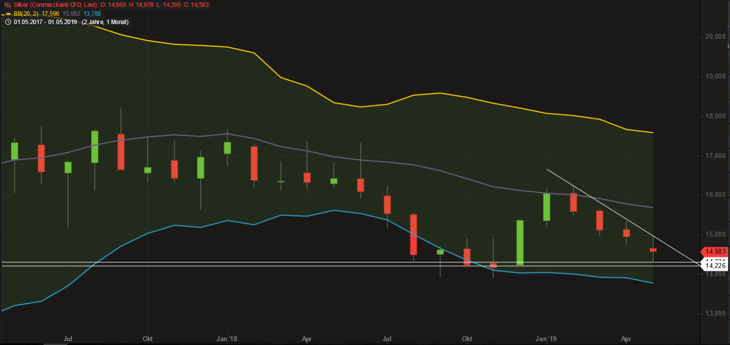 Auf Wochenbasis ist der Silberpreis vom Unteren Bollingerband nach oben abgeprallt und hat einen Doji (eine Trendwende gebildet). Diese bedarf aber noch der Bestätigung durch die folgende Wochenkerze.