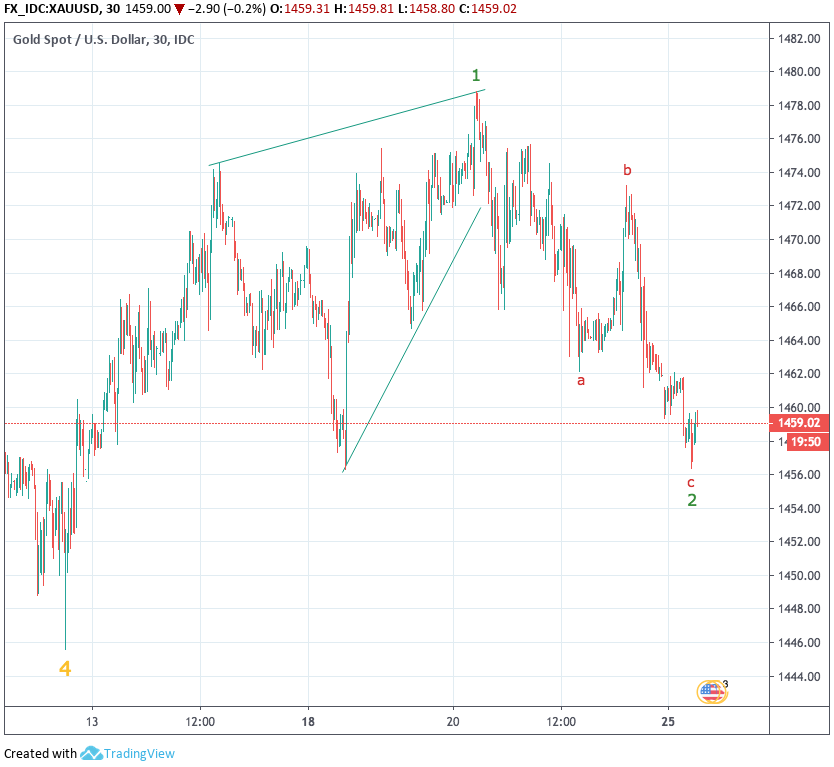 Momentan läge eine perfekte a=c Korrektur in Welle 2 vor. (bei 1.456,85 $ - tatsächliches Tief: 1.456,52 $)