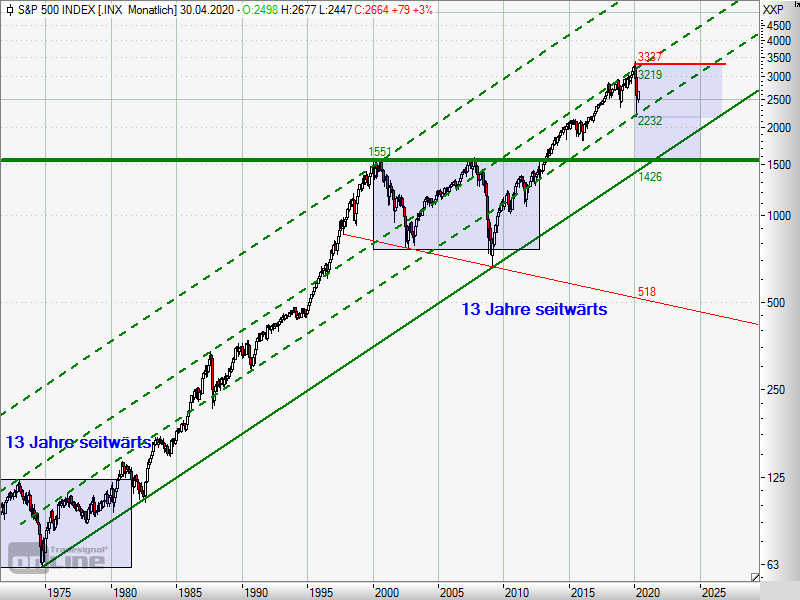 Durch Unmengen von Geld kann man den Abstieg aufhalten, aber es führt auch zur Inflation wenn die Wirtschaftsstrukturen kaputt sind. Ich sehe 1500 für möglich, aber mehr wohl auch nicht. Ich denke wir werden stagnieren und die Inflation wird wachsen. Deshalb wäre es schön wenn jetzt die EM wie 1970 durchstarten werden. Ich sehe den S&P500 so wie im chart, blaues Kätchen...