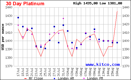 Der Platinpreis ist seit gestern Nachmittag um 50 US-Dollar gestiegen und erreichte am Morgen 1.450 USD je Feinunze, den höchsten Stand seit Anfang Juli. Auslöser für den Preissprung war die Eskalation der Gewalt in Südafrika, das 75% der weltweiten Platinminenproduktion verantwortet. Gestern wurden bei Auseinandersetzungen zwischen streikenden Minenarbeitern und der Polizei nahe der Platinmine Marikana des weltweit drittgrößten Platinproduzenten Lonmin mehr als 30 Arbeiter getötet. Das Unternehmen hatte wegen der Auseinandersetzung zwischen rivalisierenden Minengewerkschaften Mitte der Woche sämtliche Platinminen im Land vorübergehend geschlossen. Lonmin produziert 750 Tsd. Unzen Platin pro Jahr und stellt damit 12% des weltweiten Angebots.