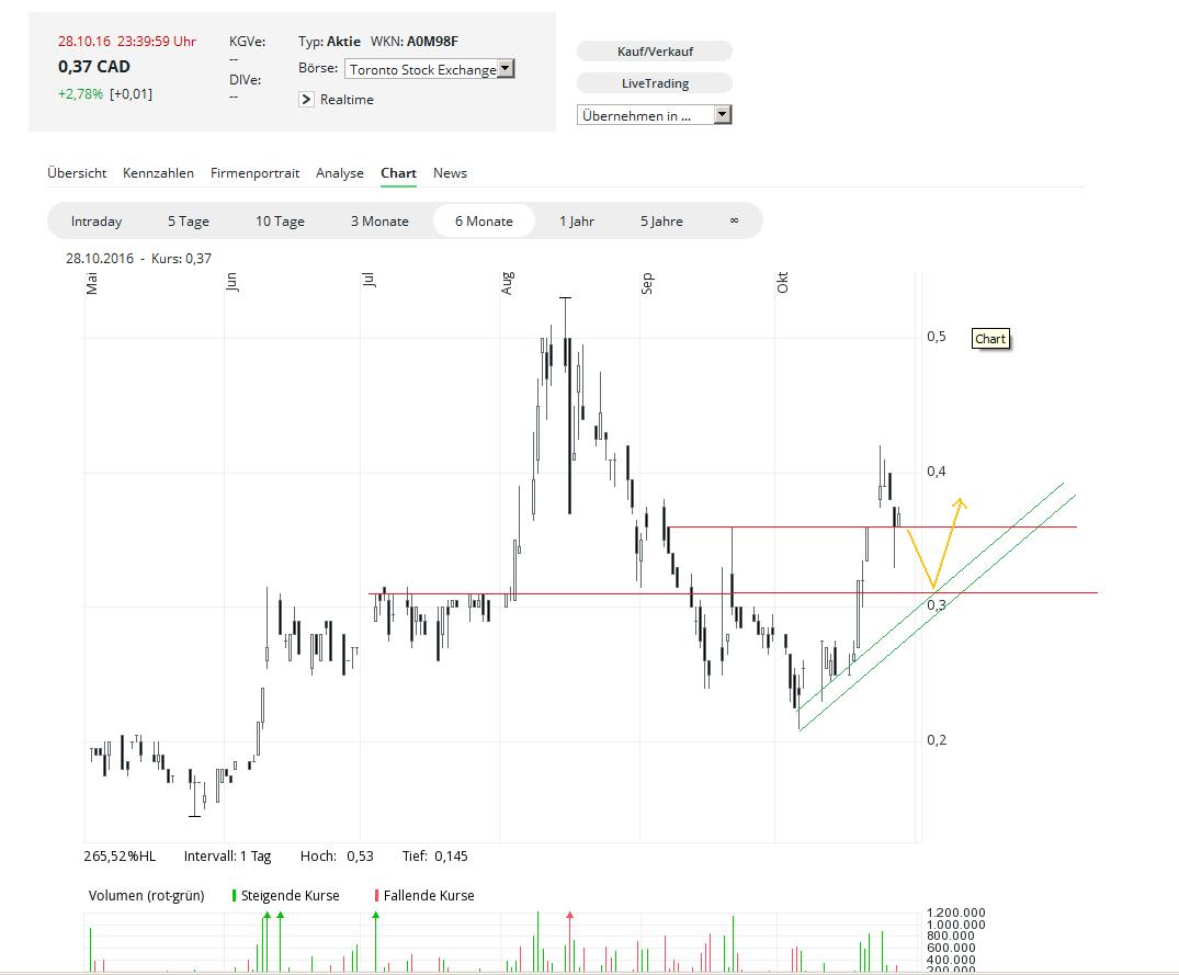 Der Kurs erholt sich etwas verspätet kräftig auf 0.32C$ + 20,75 %, hat den Widerstand bei 0,30 C$ genommen.