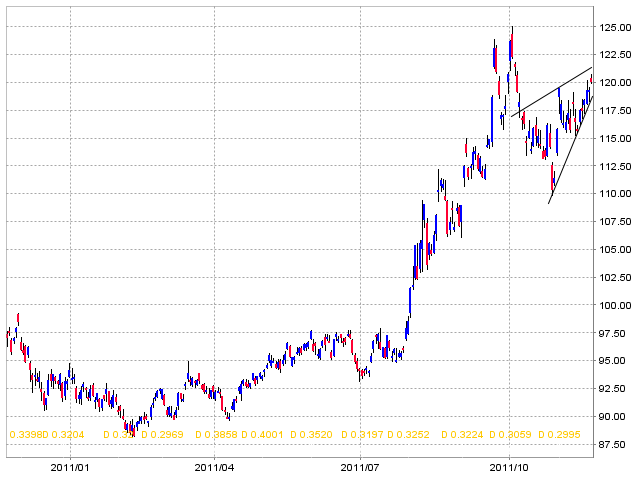 Diese Korrelation hat sich aber seit ein paar Tagen geändert. Während Gold korrigierte, hat sich TLT gestern ein neues kurzfristiges Top (wie der USD) erkämpft.Wie weiter? Der Trend beim USD und bei US-Bonds ist noch immer nach oben gerichtet. Für mich macht dies aber einen bear-wedge-Eindruck. Ein Unterschreiten dieser Unterstützungslinie würde wohl diesem Szenario grosse Plausibilität geben.