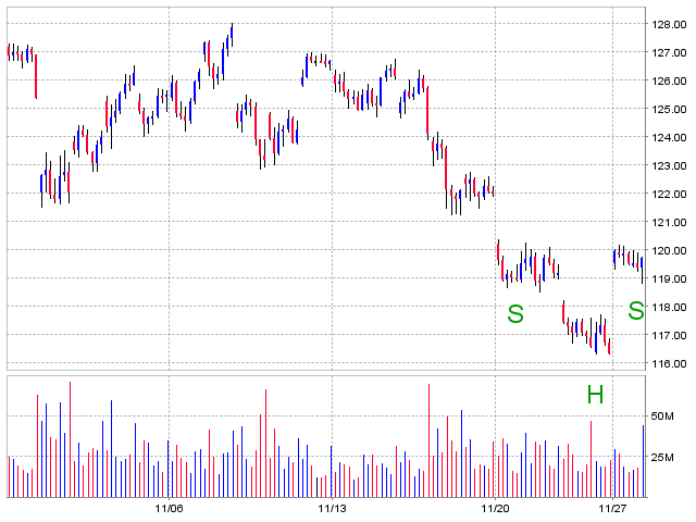 Der Gesamtmarkt würde ich als verhalten positiv beurteilen, der S&P 500 sieht ein wenig wie eine inverse S-H-S aus (siehe Chart von SPY), was noch 2 oder 3 % nach oben geben könnte. Dagegen sprechen würde die Stärke des USD und von Bonds im Tagesverlauf.
