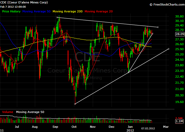 Auch Gold- und Silberaktien dürften dann nochmals anziehen. Hier der Chart von CDE. Die gefallen mir eh recht gut, habe aber unter dem Widerstandsbereich verkauft, würde aber gerne wieder rein. Hier bin ich mir aber nicht ganz sicher, ob die Auflösung nach oben kommen wird. Die letzten zweimal kam die Auflösung nach unten, aber insgesamt sieht es nach einer grossen Konsoldierung aus, deren Auflösung nach oben erfolgen sollte, entweder jetzt oder dann nach einem weiteren kurzen Taucher.