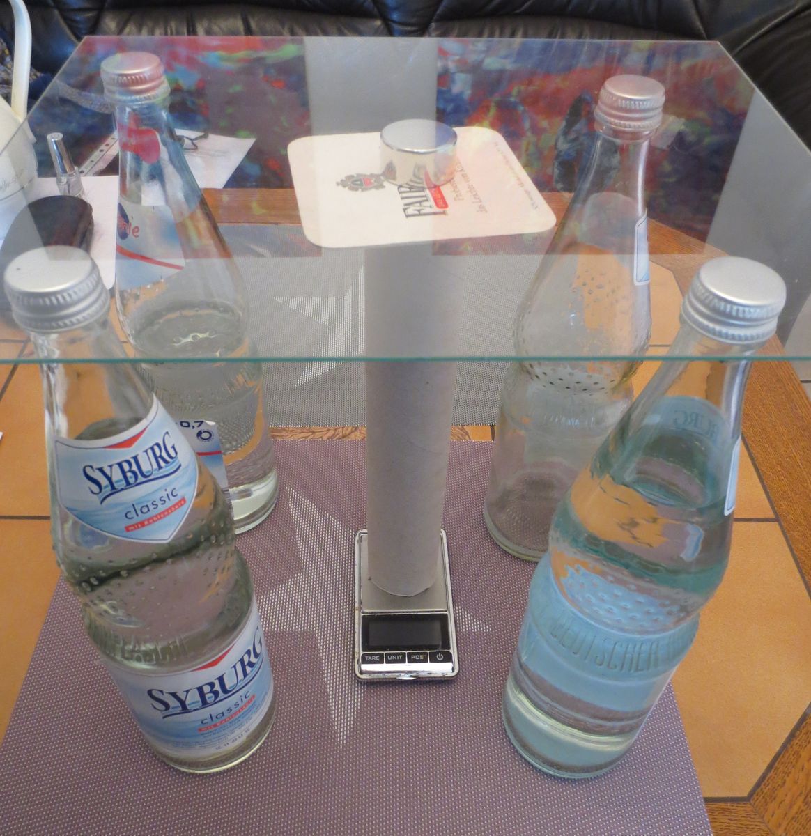 Silber ist ganz schwach magnetisch; Gold ist antimagnetisch (wird abgestoßen) Platin wiederum ist ganz leicht magnetisch. Wird "Silber" abgestoßen, ist es keines. Bau den Apparat so, wie ich den mir mal gebaut habe, dann hast Du das Ergebnis digital auf der Waage stehen. Die Drehverschlüsse der Flaschen sind Libellen. Damit kannst Du den Abstand Magnet Unterkabnte Glasscheibe nach Auganmaß (ca. 1 bis 2 mm) sehr genau und gleichmäßig einstellen und prüfen, dass es beim Wiegen keinen Kontakt Scheibe-Magnet gibt. Gibt ja auch schwerere Objekte... Aber bitte nicht mit 5 kg Silberbarren machen, das hält so eine Scheibe bei der Anordnung sicher nicht aus.