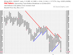 Klassische Charts sehen hier inzwischen grausam aus, deshalb mal ein P&F Chart in Standardversion. Kursziel 0,30 C$, was kein Evangelium sein muß.