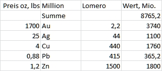 Im PDF wird auch Denarius Silver erwähnt. Die haben Ag + Cu Projekt in Spanien an Land gezofen. GCM hält je nach Quelle 27- 36 % an Denarius. Hab hier mal die Werte des Lomero Projektes auf Tageskurs berechnet (alles in Mio USD).